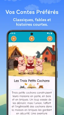 Plongez vos enfants dans un monde où la magie des contes rencontre l'apprentissage ludique. Cette application enrichissante éveille leur imagination, développe leur vocabulaire et encourage la découverte à travers des récits captivants et des aventures féeriques pour inspirer les jeunes esprits.